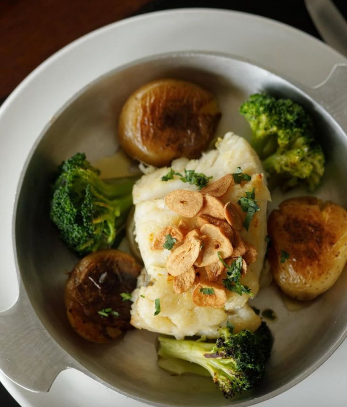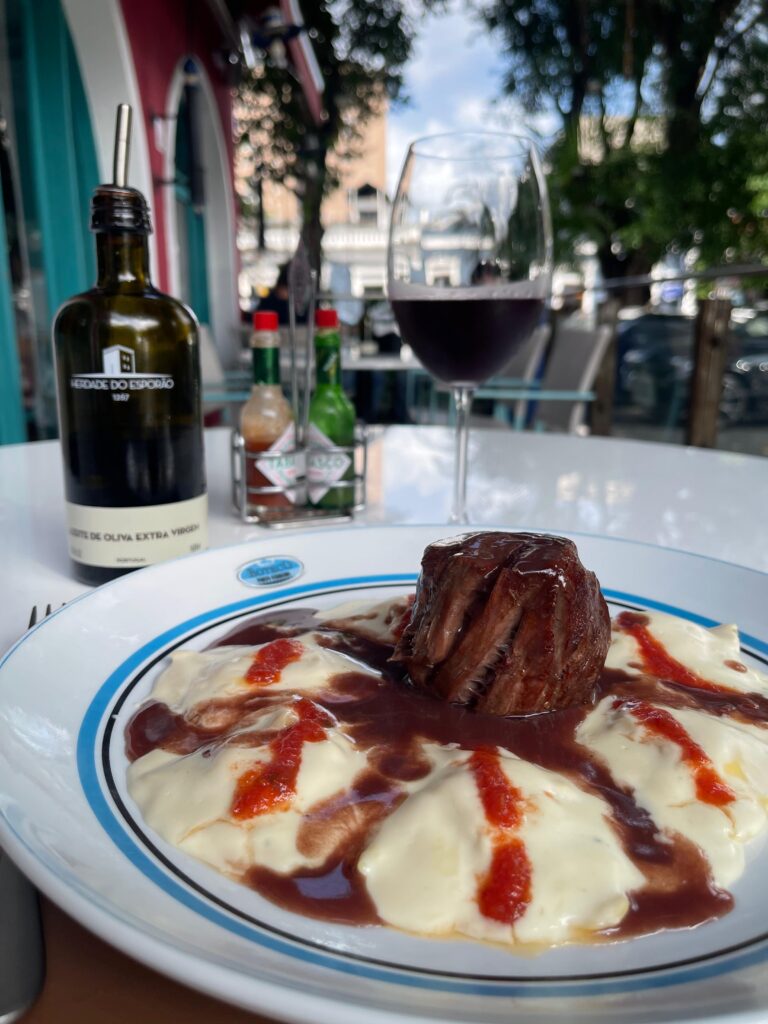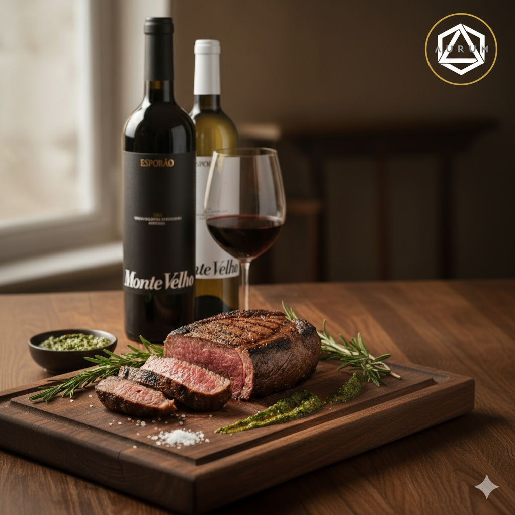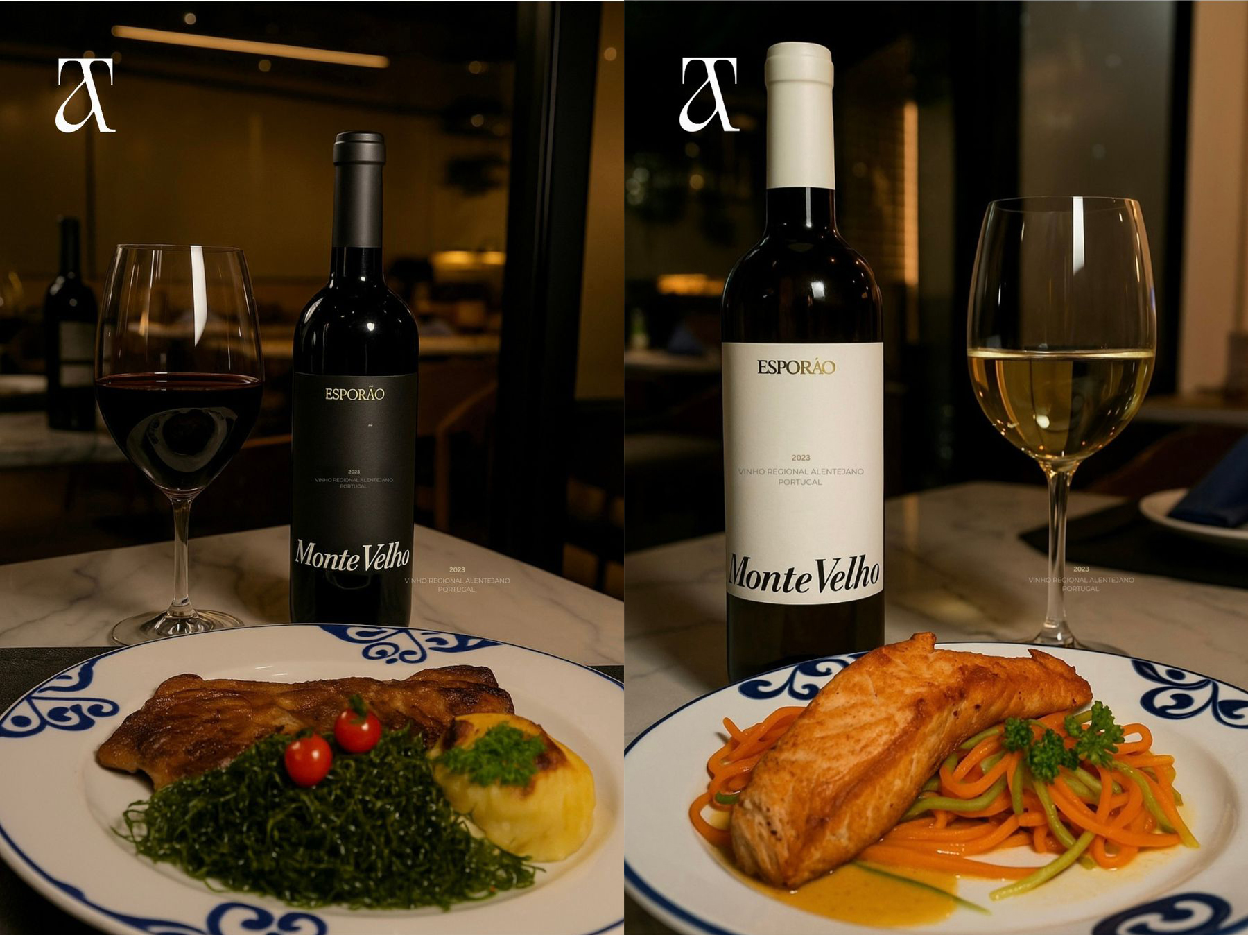 Prato: Monte Velho Branco – Salmão Grelhado ao molho de Iogurte e espaguete de abobrinha e cenoura. Monte Velho Tinto – Angus Bife de Chorizo, com Batata recheada e Couve frito