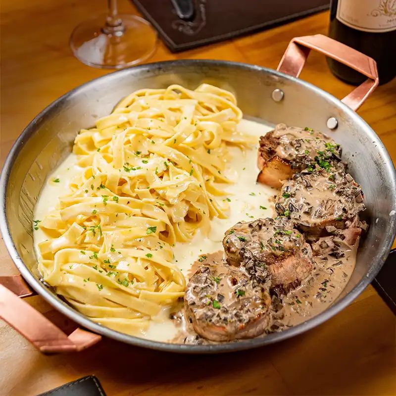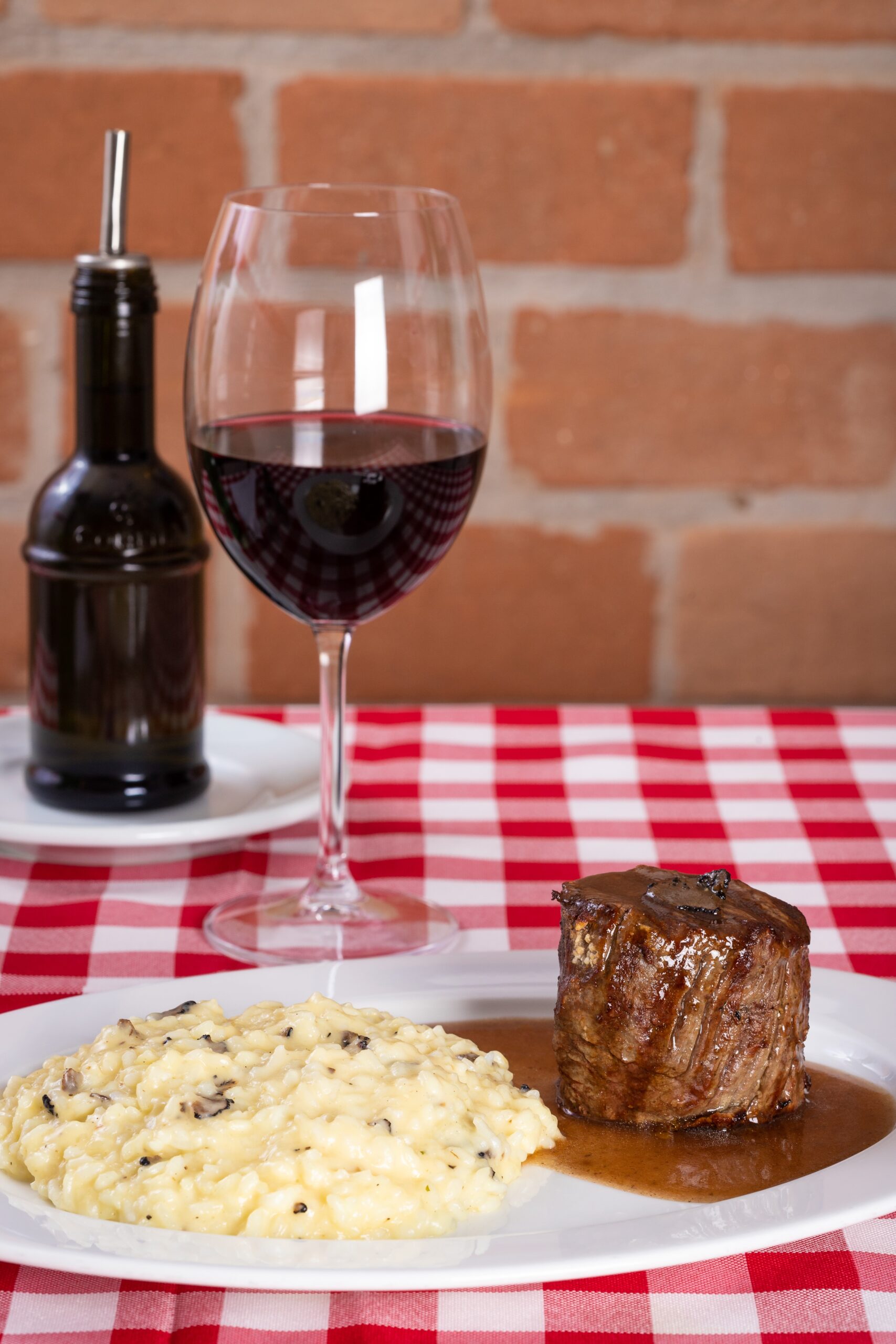 Prato: Tornedor de Filé ao Rôti de Carne com Risoto de Trufas Negras